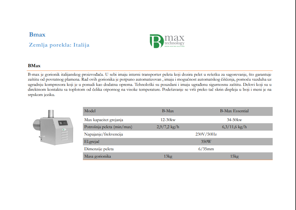 Gorionik B-Max je proizvod italijanske kompanije B-Max Technology, specijalizovan za pelet i druge biomase. Model „Home / Standard“ pokriva raspon snage od 15 do 35 kW, što ga čini pogodnim za stambene sisteme grejanja. Ima interni transporter peleta (puž) koji dozira pelet direktno do sagorevačke rešetke, što pomaže da se spreči povrat plamena.