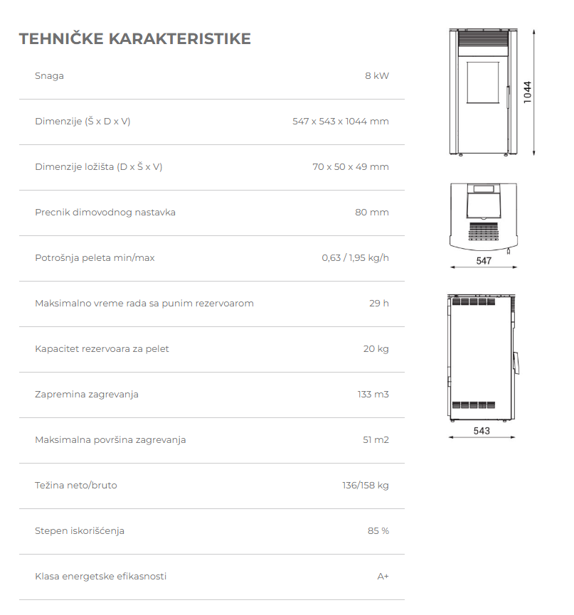 Izborom modela Alfa Plam Luca 8 kW dobijate pouzdan, energetski efikasan pelet kamin koji je idealan za manje ili srednje prostorije. Sa dovoljnim kapacitetom rezervoara, ventilatorom i efikasnim sagorevanjem, predstavlja praktično rešenje za grejanje sa minimalnim angažovanjem i dobrim rezultatima — komforan, moderan i ekonomičan uređaj.