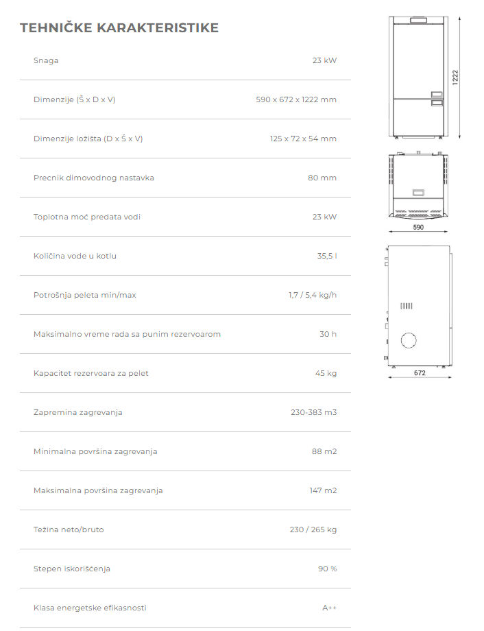Izborom ovog modela dobijate balans između snage i kompaktnosti — izuzetne performanse u relativno malom formatu. Snaga od 23 kW, dobar kapacitet peleta, visoka efikasnost i standardizovana konstrukcija čine ga odličnim izborom za centralno grejanje u domaćinstvu.