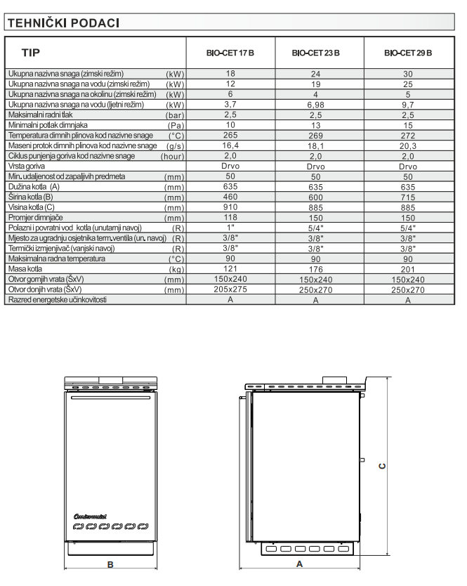 Centrometal BIO‑CET 17 kW je etažni kotao na čvrsto gorivo sa gornjim odvodom dima, sa efektivnim prenosom toplote u grejnu vodu (12 kW) i dodatnim grejanjem prostora (5‑6 kW). Kompaktnih dimenzija (460 × 910 × 635 mm), sa sadržajem vode 29 l i radnim pritiskom do 2,5 bar, dizajniran prema standardima EN 12815. Pogodan za ugradnju u zatvorene i otvorene sisteme, sa ili bez akumulatora.