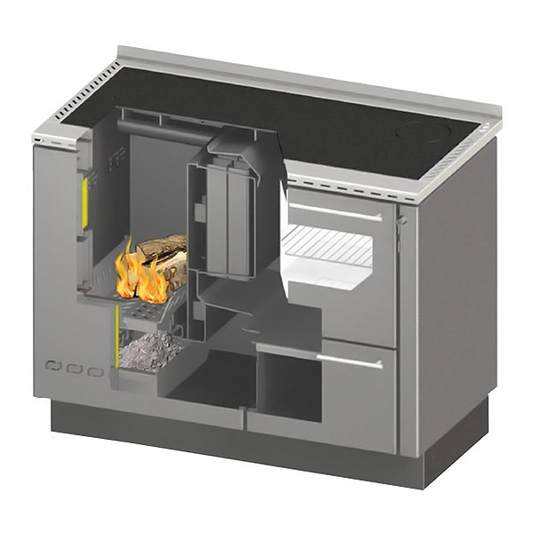 Moderan dizajn i dimenzije (1000 × 885 × 635 mm) omogućavaju da se uklopi i u kuhinjske module, dok vatrostalno staklo na vratima ložišta daje efekat kamina.