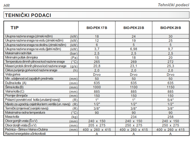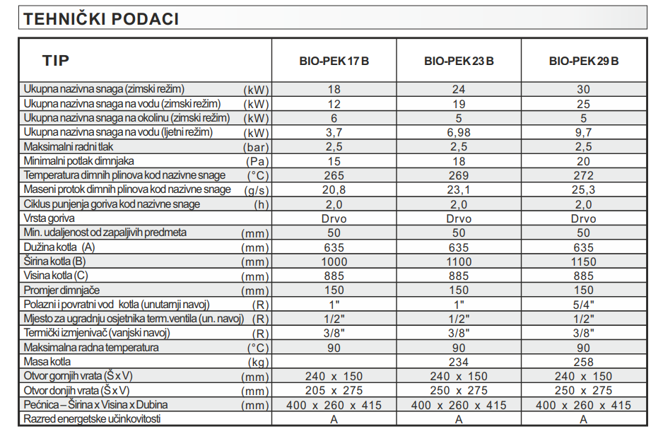 BIO‑PEK 17 B je špored/kotao na čvrsto gorivo sa snagom 18 kW (12 kW u vodu + 6 kW grejanje prostora). Ima 23 l sadržaja vode, priključak dimnjaka Ø150 mm, i prikladan je za grejanje, kuvanje i pečenje u kućnim uslovima.