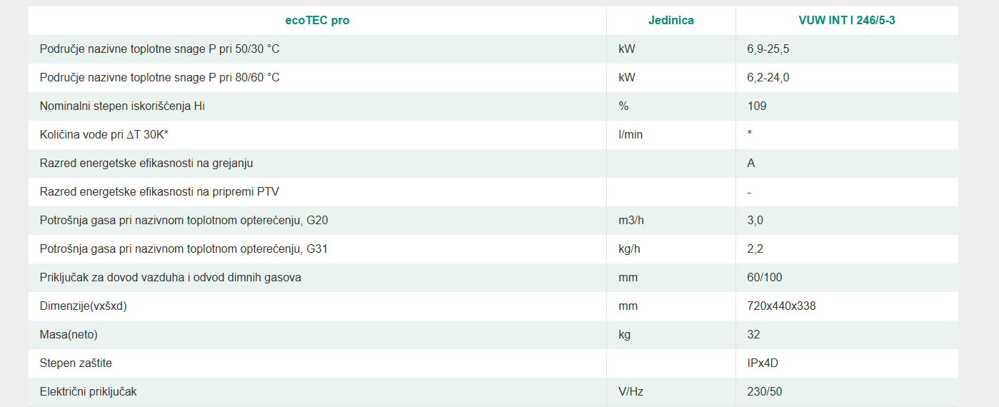 Vaillant ecoTEC Pro VU INT I 246/5-3 cirko je izvanredna opcija za one koji žele kombinovati visoku efikasnost kondenzacije sa kompaktnim i pouzdanim kotlom za grejanje. Zbog širokog modulacijskog raspona, kotao radi tiho i štedljivo — kada je potražnja mala, ne troši puno, a kada je potrebna veća snaga, može je pružiti. Inoks izmenjivač garantuje dug životni vek čak i kod intenzivnog rada. Sa eBUS vezom i naprednim dijagnostičkim interfejsom (DIA), ovo je kotao spreman za moderni grejni sistem i pametnu regulaciju. Ako Vam je bitna ušteda energije, dugotrajnost i fleksibilnost montaže, ovaj model je odličan izbor.