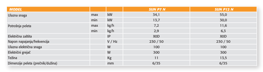 Gorionik SUN P7 N je razvijen od strane Ferrolija kao efikasno i pouzdano rešenje za peletne kotlove i sisteme centralnog grejanja. Raspon snage mu je od 13,7 kW do 34,1 kW, što ga čini vrlo fleksibilnim – može prilagođavati rad konkretnoj potražnji toplote. Potrošnja peleta se kreće od 2,9 do 7,2 kg/h, zavisno od snage i režima rada. Za paljenje koristi električni grejač + fotoćeliju (fotootpor), što omogućava automatsko uključivanje i sigurno paljenje. Sigurnosni termostat dimnih gasova je podešen na 85 °C, čime štiti sistem od pregrevanja. Ulazna snaga napajanja je 230 V / 50 Hz, dok je snaga pri paljenju do 300 W. Dimenzije gorionika su 447 × 250 × 312 mm, a težina je oko 11 kg.