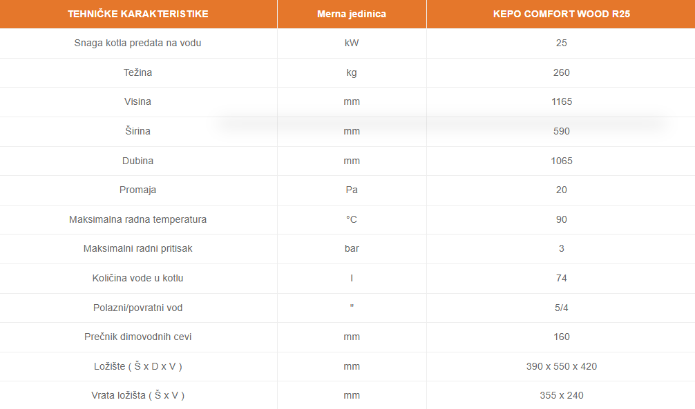 Kepo Comfort Wood R 25 kW je tropromajni kotao na čvrsto gorivo, dizajniran za efikasno grejanje stambenih objekata. Odlikuje se kvalitetnom izradom od kotlovskog lima, velikim vratima za ložište, i dobrom iskoristivošću toplote zahvaljujući izmenjivačima toplote. Pogodan je i za loženje drvetom i delimično drugim čvrstim gorivima.