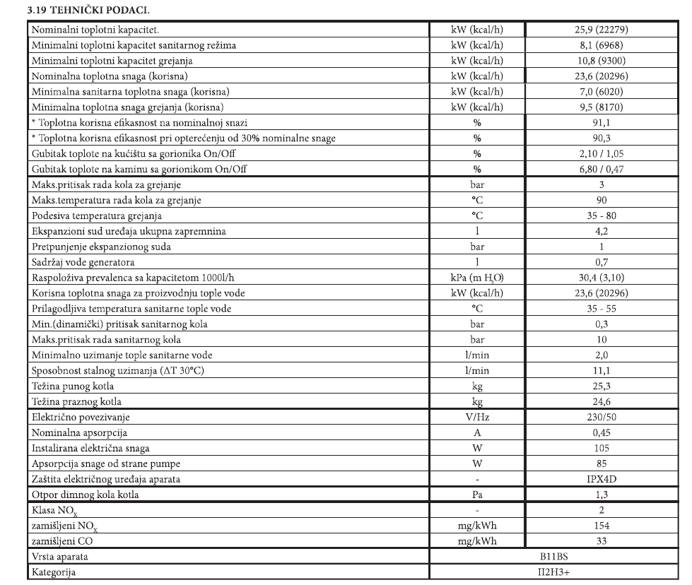 Dimenzije kotla su kompaktnе: 440 × 751 × 240 mm, a težina je 24,6 kg.