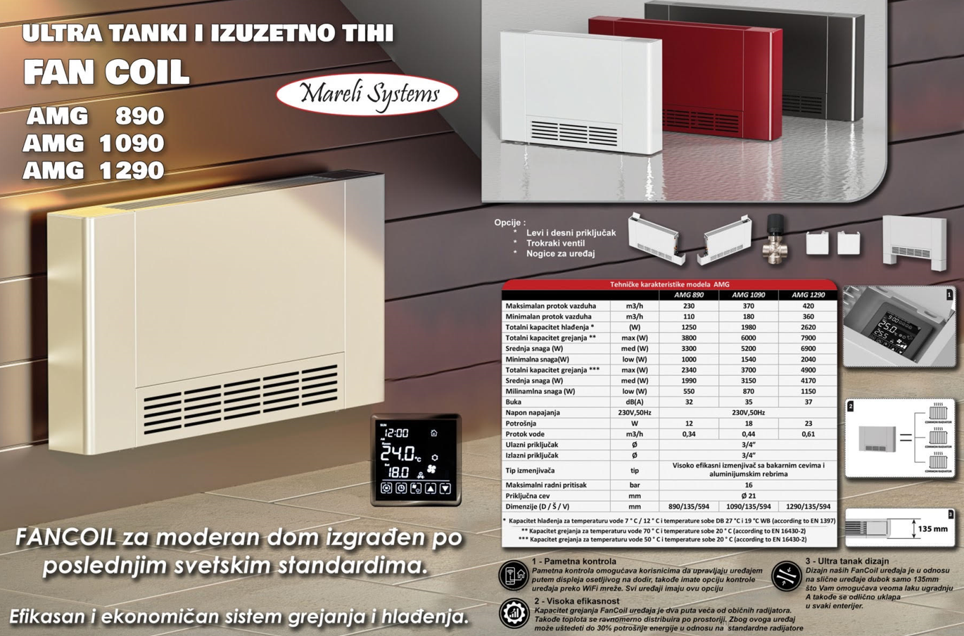 Mareli AMG 890 – ultra tanak parapetni/podno-montirani fan coil uređaj (ventilokonvektor) sa hlađenjem, grejanjem i WiFi kontrolom – idealan za moderne enterijere i sisteme grejanja/hladjenja.